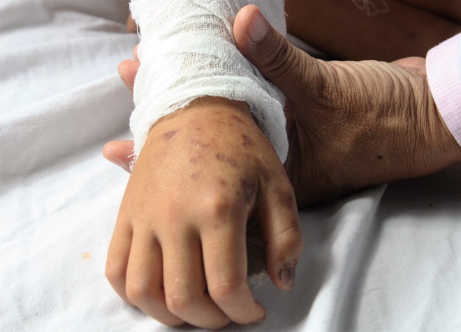 Vết cắn của rắn lục đuôi đỏ trên tay một bệnh nhi ở Bến Tre (Ảnh: zing.vn)