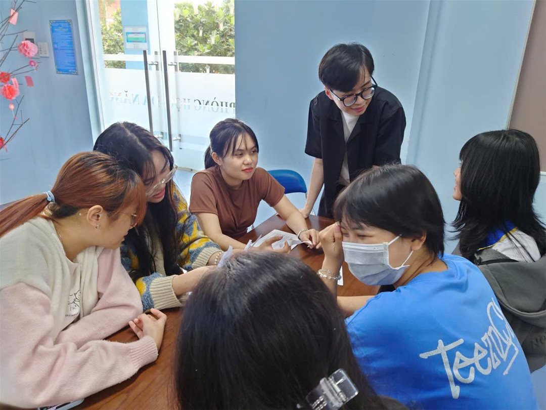 Không khí trở nên sôi nổi ngay từ đầu khi các bạn được chia nhóm nhỏ để trò chuyện về chủ đề "bạn thân" bằng tiếng Nhật. Vừa thân thiện, vừa giúp rèn luyện sự tự tin khi giao tiếp.